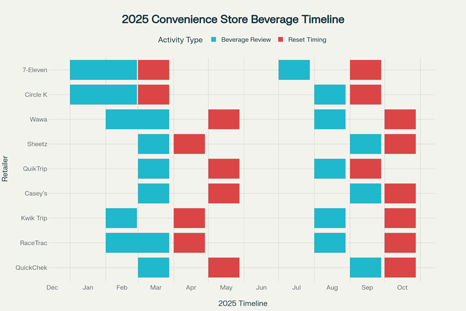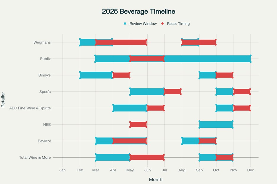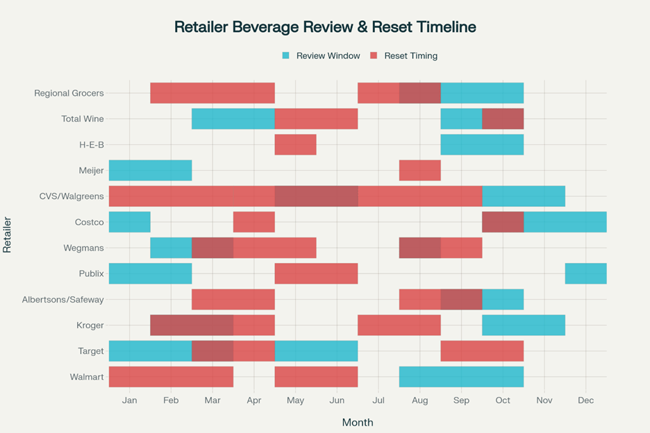 Every retailer in America runs a to-the-minute clock for beverage resets, reviews, and resets again. These aren’t suggestive guidelines; they are written into the stone tablets of category management. The unlucky majority? They hear about a slot after it’s been filled. The ones with velocity? They already pitched, onboarded, and polished up their POs months ago.